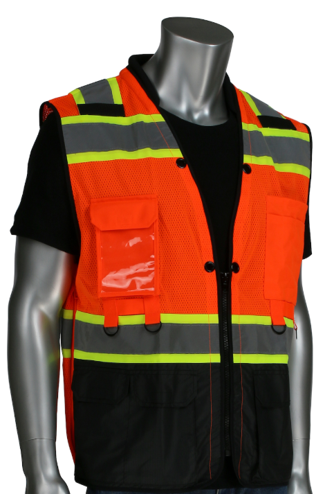 ANSI Type R Class 2 Two-Tone Eleven Pocket Surveyors Vest with Solid Front and Mesh Back