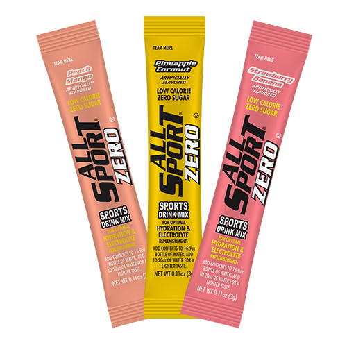 All Sport .11 Ounce Exotic Variety Flavor ZERO Electrolyte Powder Mix Stick Sugar Free/Low Calorie Electrolyte Drink (50 Per Box) - Strawberry Banana flavor, Peach Mango flavor, and Pineapple Coconut flavor