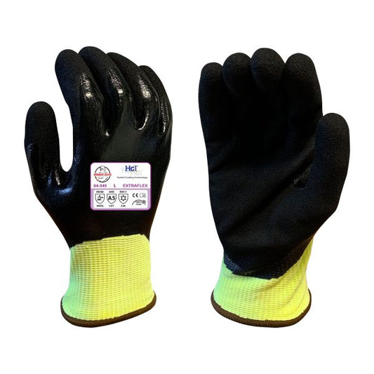 15g ExtraFlex® Hi-Vis Engineered Liner, With 7g Poly-Acrylic Lining, Black Smooth Nitrile Fully Dipped, Black Nitrile Micro Foam HCT® Palm Dipped, Thumbcrotch Reinforcement, ANSI A5