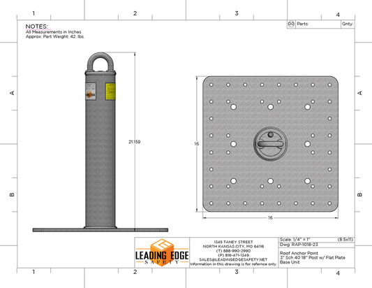 18” Tall Roof Anchor Point / 16’ x 16” X 3/8” Base Plate RAP-18-1616-23