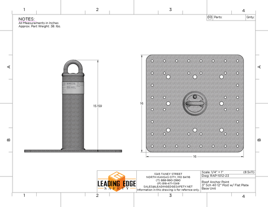 12” Tall Roof Anchor Point / 16’ x 16” X 3/8” Base Plate RAP-12-1616-23