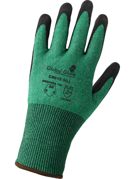 Global Glove CR615-6 Green-and-White HPPE Nitrile-Coated Gloves with Cut, Abrasion, and Puncture Resistance - CR615 – Cut Level A6, 18-Gauge