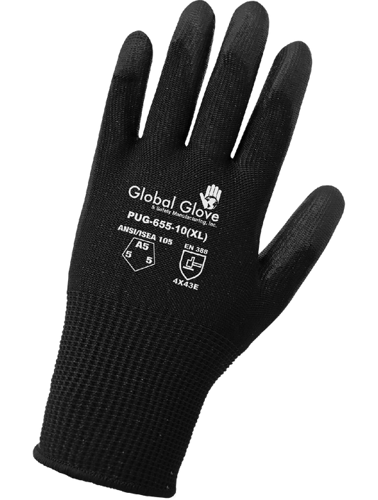 Global Glove PUG-655-6 Smooth Polyurethane-Coated Black Seamless HPPE Cut, Abrasion, and Puncture Resistant Gloves - PUG-655 – Cut Level A5, 13-Gauge