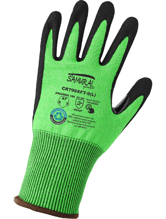 Global Glove CR799XFT-7 Samurai Glove® High-Visibility Nitrile Coated 18-Gauge rPET Recycled Cut Resistant Gloves with Touch Screen Fingers - CR799XFT – Cut Level A7