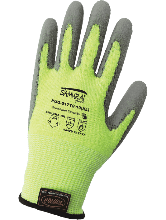 Global Glove PUG-517TS-7 Samurai Glove® High-Visibility Polyurethane Coated Touch Screen Compatible 13-Gauge TuffKut® Gloves with Cut, Abrasion, and Puncture Resistance - PUG-517TS – Cut Level A4