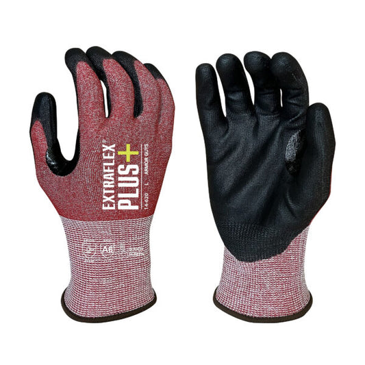 Armor Guys 14-620-XS 15 Gauge, ExtraFlex Plus® Red Engineered Liner With Black PU Palm Coating, Thumb Croth Reinforcement, Touch Screen, ANSI 6 – Cut Level A6, 15-Gauge, Polyurethane