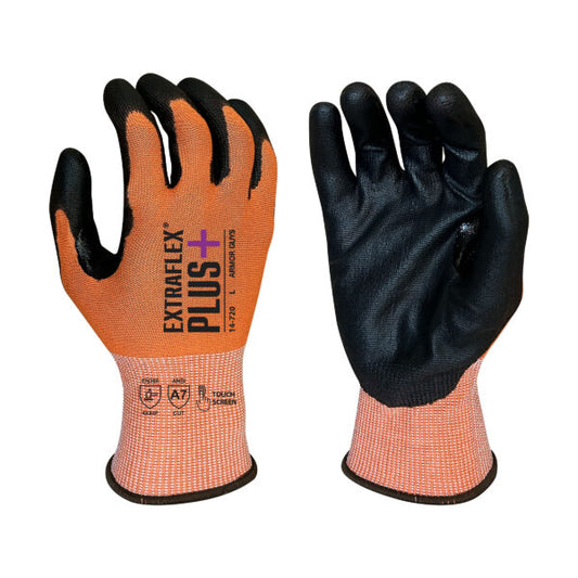 Armor Guys 14-720-XS 15 Gauge, ExtraFlex Plus® Orange Engineered Liner With Black PU Palm Coating, Thumb Croth Reinforcement, Touch Screen, ANSI 6 – Cut Level A7, 15-Gauge, Polyurethane