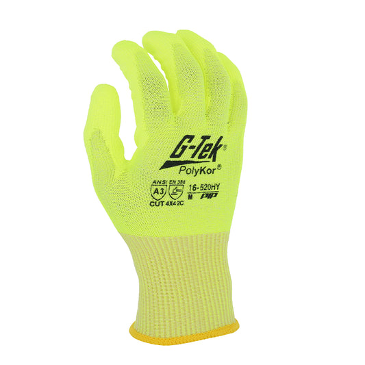G-Tek® PolyKor®: Hi-Vis Seamless Knit PolyKor® Blended Glove with Polyurethane Coated Flat Grip on Palm & Fingers